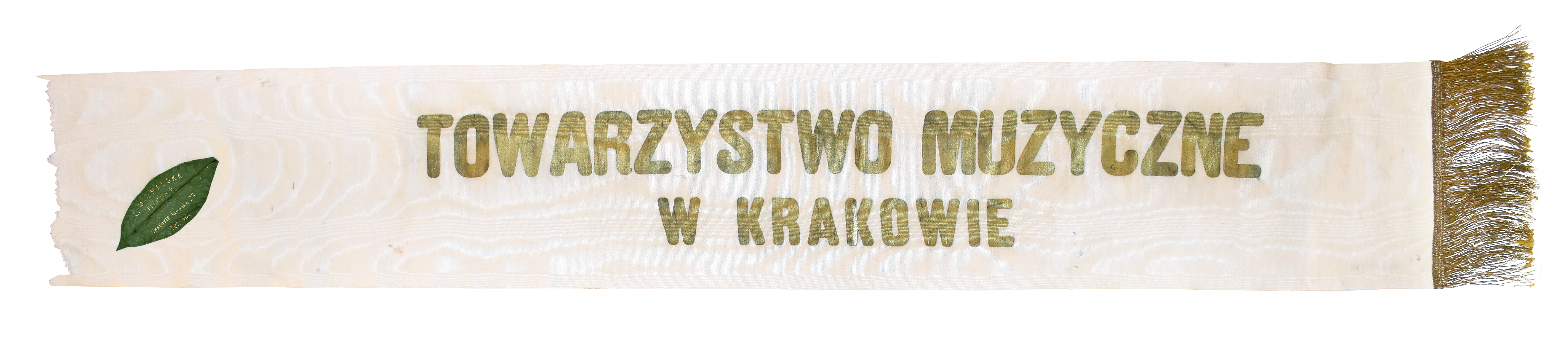 Wstęga dla Marii Konopnickiej z okazji jubileuszu 25 - lecia pracy literackiej. Wstęga w kolorze białym. Napis wykonany złotem o treści :"TOWARZYSTWO MUZYCZNE W KRAKOWIE". Koniec szarfy przy napisie obszyty złotą taśmą z frędzlami. Przeciwległy koniec obcięty. Do szarfy dołączono sygnaturę wykonawcy- zielony listek z tłoczonym napisem " C. MICHALSKA FLEURISTE CRACOVIE Szewska 23, tel.363" Konserwacje obiektu dofinansowano ze środków Ministra Kultury i Dziedzictwa Narodowego pochodzących z Funduszu Promocji Kultury - państwowego funduszu celowego.
